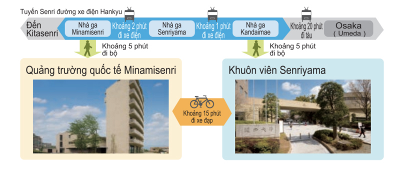 Mất khoảng 15′ đi xe đạp từ quảng trường quốc tế Minamisenri nơi có khóa học đặc biệt dành cho du học sinh đến khuôn viên Senriyama nơi có khuôn viên chính của đại học Kansai.