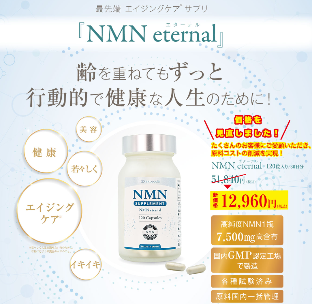 Sản phẩm tại đường dẫn bạn cung cấp là NMN Eternal®, một loại thực phẩm chức năng cao cấp thuộc phân khúc trẻ hóa da và tăng cường sức khỏe của thương hiệu Est Lab (Nhật Bản).